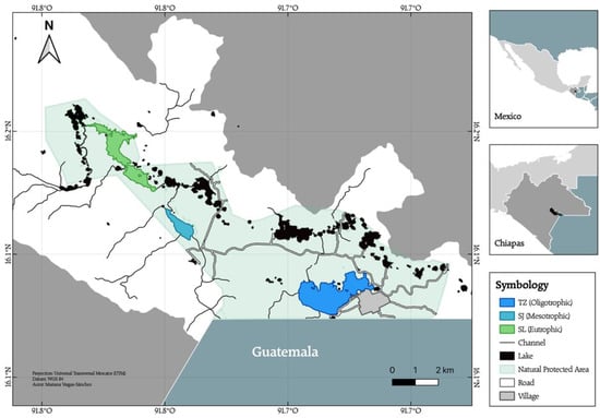 Although lakes receive surface inflows from the Río Grande de Comitán, which runs through urban and agricultural areas, the primary water source is groundwater, which has generated a complex karst landscape crossed by a system of dolines, uvalas, and poljes created by the dissolution of carbonate rocks [32]. The study was carried out on three selected lakes that typify three different trophic statuses (based on previous records of concentration of Chl-a, TSS, total phosphorous, and total nitrogen in the water column) that can be founded in the lake district: oligotrophic Tziscao (TZ), mesotrophic San José (SJ), and San Lorenzo (SL). The main characteristics of the three lakes are described in Table 1. The lakes are warm monomictic, circulating during the dry/cold winter, and remain stratified for the rest of the year along the rainy/warm seasons.
