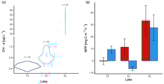 Violin plot of Chl-a concentration (A) and bar graph of net primary production -NPP- rates (B) in the three study lakes, oligotrophic Tziscao (TZ), mesotrophic San José (SJ), and eutrophic San Lorenzo (SL), n: number of observations. Note the break in the y-axis scale of (A). Red = the rainy/warm season, and blue = the dry/cold season.