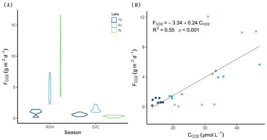 Violin plot of the FCO2 in the three lakes during the rainy/warm (R/W) and dry/cold (D/C) seasons (A) and linear correlation between the CCO2 and FCO2 (B). The 95% confidence level interval for predictions from a linear model is marked with shadow. (Oligotrophic TZ: dark blue points, mesotrophic SJ: light blue points, and eutrophic SL: green points).