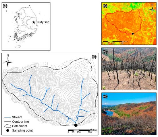This study was conducted in a headwater catchment (32.4 ha) located in Andong-si, 206 km South of Seoul (37°33′ N, 128°54′ E) (Figure 1a,b). According to the Andong weather station of the Korea Meteorological Administration (KMA), the mean annual precipitation ± standard deviation (SD) in this region from 2002 to 2021 was 1015.3 ± 200.8 mm (range: 737.9–1579.3 mm), of which 55% occurred in the summer. The mean annual temperature ± SD was 12.4 ± 0.5 °C (range: 11.3–13.2 °C). The elevation of the monitoring catchments ranges from 161 to 395 m above sea level, with hillslope gradients ranging from 0.4 to 47° with a mean of 27°. The underlying geology consists of sedimentary rocks. The catchment is vegetated by 21–50-year-old Korean red pine (Pinus densiflora S. et Z.), which facilitated the ignition and propagation of fires in the catchment. The stream channel was 0.9 km length, 4.0 m wide, and had a 0.25 m/m slope. This region was severely damaged by a forest fire from 21 February, 15:20 to 23 February 2021 7:20 KST (Korean Standard Time), and due to strong winds of up to 13 m/s, 419 ha of forest in the sur-rounding area was burned, causing property damage of KRW 17.7 billion [58]. Subsequently, the entire catchment was burnt out with stem and crown damage (Figure 1c–e).