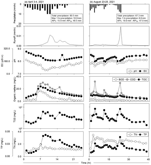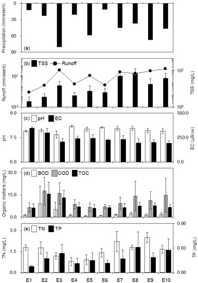 Table 1 lists the temporal changes in the observed water quality parameters (pH, EC, BOD, COD, TOC, TSS, TN, and TP), runoff, and rainfall responses for 10 rainfall events. Total precipitation and runoff during the rainfall events were 11.5–80.5 and 0.18–49.55 mm, respectively, with seven antecedent dry days (Figure 2a,b).