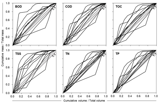 Most pollutant constituents were discharged intensively during the early stages of rainfall with the persistent spring drought in the ROK [75,76]. As shown in Figure 4, the pollution parameter loads for most of the monitoring period were above the 1:1 line. Thus, the first flush had strong effects, which is consistent with the results of previous studies [34,77,78]. The first flush, or the initial surface runoff after a rainfall event, comprises most of the pollution in streams [32,34]. In addition, the concentration of pollutants decreased as a response to increased rainfall and runoff volume [68]. According to Deletic [79], the first-flush effect (i.e., the initial runoff being more polluted than the subsequent runoff) may appear in some runoff events but not in others at the same sites.
