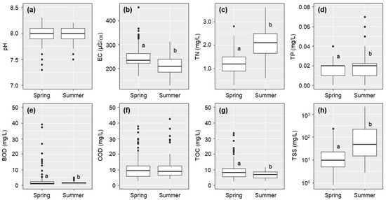 Comparison of observed water quality parameters (i.e., (a) pH, (b) EC, (c) TN, (d) TP, (e) BOD, (f) COD, (g) TOC, and (h) TSS) between spring (E1–E6) and summer (E7–E10) in the immediate post-fire period. Mann-Whitney U test is indicated in separate bold letters (a and b) above the bar graph (p < 0.05). EC: electrical conductivity, TN: total nitrogen, TP: total phosphorus, BOD: biological oxygen demand, COD: chemical oxygen demand, TOC: total organic carbon, TSS: total suspended solids.