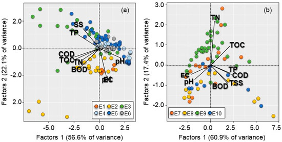 Biplot of principal components for observed water quality parameters in (a) spring (E1–E6) and (b) summer (E7–E10) in the immediate post-fire period. EC: electrical conductivity, BOD: biological oxygen demand, COD: chemical oxygen demand, TOC: total organic carbon, TSS: total suspended solids, TN: total nitrogen, TP: total phosphorus.
