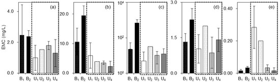 Event mean concentration (EMC) of pollutant parameters ((a) BOD, (b) COD, (c) TSS, (d) TN and (e) TP) between burned (in this study, B1 and B2) and unburned (in previous studies, U1, U2, U3, and U4) headwater catchments. B1 and B2 indicate EMC of pollutant parameters in the spring and summer, respectively. U1, U2, U3, and U4 indicate the EMC of pollutant parameters in Yur and Kim [97], Kang et al. [98], Yoon et al. [99], and NIER [100], respectively. Four unburned catchments were focused on forested headwater catchments from spring to summer. BOD: biological oxygen demand, COD: chemical oxygen demand, TSS: total suspended solids, TN: total nitrogen, TP: total phosphorus.