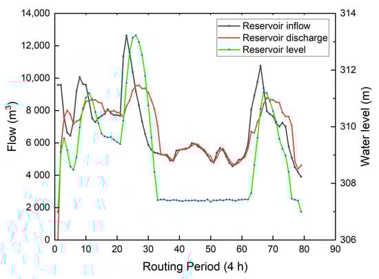 It can be seen from Figure 6 and Figure 7 that when the inflow flow of Sanmenxia Reservoir and Xiaolangdi Reservoir is small, the reservoir discharge flow is equal to the inflow flow, and the water level of the reservoir remains basically unchanged. When the inflow of Sanmenxia Reservoir and Xiaolangdi Reservoir is large, considering the discharge capacity of the reservoir and the bearing capacity of the downstream river channel, the reservoir begins to store water and the water level starts to rise, sharing the pressure for the downstream flood control. After the reservoir completes a flood control operation without considering the water storage, the water level should return to the initial regulation level to cope with the arrival of the next flood. From Figure 6 and Figure 7, the water level of Sanmenxia and Xiaolangdi reservoirs returned to the initial regulation level at the end of flood control regulation. It not only ensures the flood control safety of the reservoir itself and the downstream, but also provides guarantee for the next flood control operation of the reservoir.