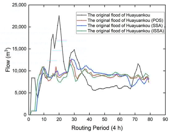 Figure 8 shows the flood process of Huayuankou, a downstream control point. The black line on the top represents the flood process of control points when there is no reservoir regulation. The red, blue and green lines represent the flood process of control points when the POS algorithm, SSA algorithm and ISSA algorithm are used to solve the model. It can be seen from Figure 8 that when the ISAA, SSA and POS algorithms are used to solve the model, the flood peak at the control point at Huayuankou can be reduced. However, different algorithms have different effects when solving the model. See Table 3 for flood data and algorithm initialization parameters of the Huayuankou control point.