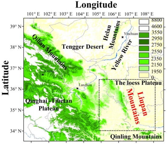 Topography of the Liupan Mountains and the study area (denoted by the black dashed frame).