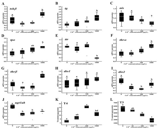 Significant upregulation of tshβ (1.55 fold), thyroglobulin (tg) (2.38 fold), thyroid peroxidase (tpo) (1.84 fold), thyroid hormone receptor-α (thrα) (2.10 fold), and thyroid hormone receptor-β (thrβ) (1.51 fold) were detected in the highest Cd2+ group (1000 μg/L) (Figure 1A,B,D,F,G). However, transthyretin (ttr) expression was significantly downregulated (0.38 fold) in the 1000 μg/L Cd2+ group (Figure 1E). The expression of the type I iodothyronine deiodinase gene (dio2) (0.71-, 0.67, and 0.84 fold) and uridine diphosphate glucuronosyltransferase 1 family a, b (ugt1ab) genes (0.51-, 0.55-, and 0.66 fold) were downregulated significantly in all the Cd2+ treatment groups (10, 100, and 1000 μg/L, respectively) (Figure 1I,J). The results indicated that the sodium-iodide symporter (nis) and type I iodothyronine deiodinase (dio1) gene expression were not altered after Cd2+ exposure (Figure 1C,H).