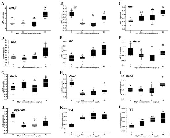 The whole-body T4 levels in the 0.1, 1, and 10 μg/L Hg2+ groups were significantly increased significantly by 1.98, 2.21, and 2.15 fold in comparison to the control samples, respectively (Figure 2K). Meanwhile, the whole-body T3 level was seen to be significantly elevated by 1.43 fold in the 10 μg/L Hg2+ treatment group (Figure 2L).