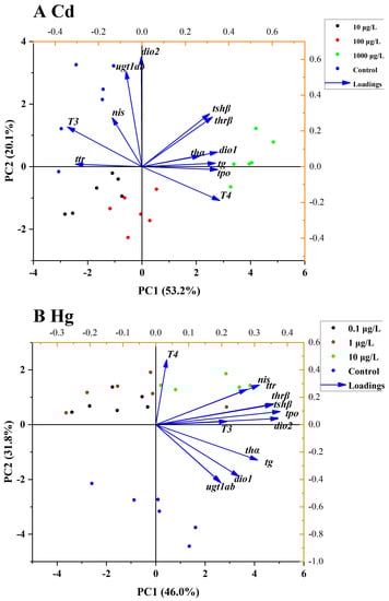 PCA is a useful tool to reduce the dimensionality of large data sets by transforming a large set of variables into a smaller one. Based on the PCA and correlation analyses, THs levels showed a strong correlation with the transcriptional levels of tshβ, tg, tpo, thα, thrβ, dio1, nis, and ttr in Cd2+-treated embryos/larvae. While the THs levels showed a strong correlation with the transcriptional levels of tshβ, nis, ttr, dio1, ugt1ab, and tpo genes in Hg2+-treated embryos/larvae. Next, we explained the role of these genes in thyroid hormone synthesis.