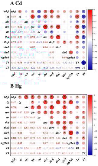 Heatmap of correlation coefficients between the thyroid hormones (THs, including T4 and T3) contents and the gene expression levels in the zebrafish embryos (2 hpf) that were treated with Cd2+ (0, 10, 100, and 1000 μg/L) (A) and Hg2+ (0, 0.1, 1, and 10 μg/L) (B) for 120 h. The scale indicates the level of positive (red) or negative (blue) correlation, and * indicates significance (* p < 0.05).