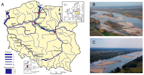 The study area—of the Vistula waterway between Gdańsk and Warsaw: (A)—map of inland waterways in Poland, (B)—the Vistula riverbed near Warsaw, (C)—the Vistula River between Toruń and Bydgoszcz (photo (C)—D. Szatten, photo (B)—M. Habel).