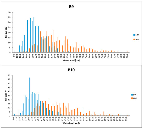 For determining the waterline ordinate, the daily water level and discharge were calculated when crossing each of the 21 bridge structures by a barge carrying a non-standard-size cargo. Data from the gauging stations presented in Table 1 were used for this calculation. Data for 1981–2016 from the Institute of Meteorology and Water Management—Polish Research Institute in Warsaw and our own measurements of the morphometric parameters of river channel beds were provided. The frequency of high and low water levels at B6, B9, and B10 cross-sections is presented as histograms in Figure 2, which are the lowest established clearances under the bridge structures. The survey to determine riverbed ordinate in cross-sections for 21 bridges (Table 2, column 5) was carried out in June 2016 using the (SBES) Teledyne ODOM ECHOTRAC E2 and receiver GPS GNSS Trimble 5800.