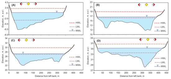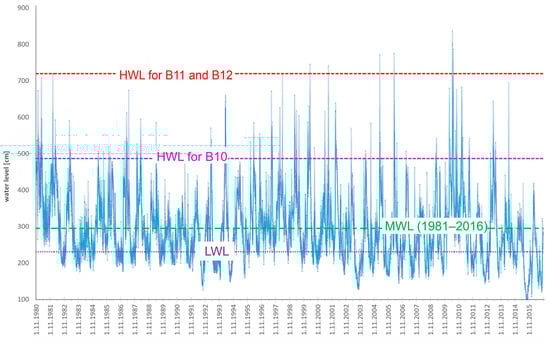 Human activity, affected by the hydrologic and morphological impacts, caused observed water levels below the LWL average for 30 days per year. In addition, a water level above the HWL average of 14–18 days per year in 1981–2016 was calculated (Table 4). The oversized cargo transport with parameters is limited by hydromorphometric conditions and is possible for 250–255 days per year.