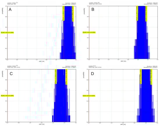 The final model takes into account the depth measurement uncertainty, the uncertainty of determining the draught in a port, error of squat determination, bottom irregularity, and influence of tides and waves are deciding factors for the UKC of ships. The program presented in [47,49] models the uncertainties mentioned above using distributions and their parameters. The following parameters are randomly selected from their distributions: