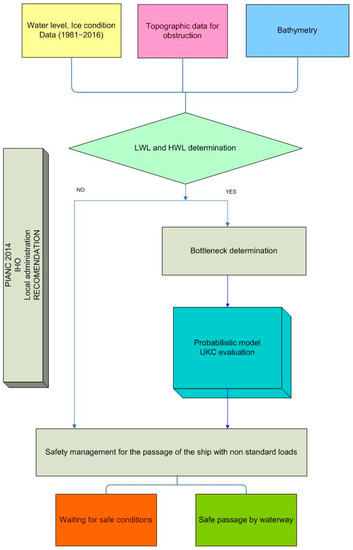 In light of available knowledge and literature according to problems which could appear during the transport of cargo on inland waterways [18,20,28] challenges us to demonstrate the possibility of non-standard load transport on waterways with a shallow channel bed such as the Vistula River in Poland. The main objective of the research was to develop a comprehensive toolkit for preliminary analysis of the safety conditions for oversized cargo transport on waterways with a shallow riverbed. The study was carried out to answer the following questions: What modelling tools will help quantitatively describe the waterway bottlenecks for navigation? How to define the limit values of hydrologic parameters when passing overhead structures safely? How to estimate the probability of safe cargo transport in the winter season (possibility of grounding contained)? What are the other potential hazards for safe navigation on waterways with shallow channel riverbeds?