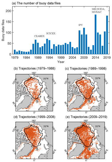 (a) The number of buoy data files available in this study from IABP between 1979 and 2019. Relevant large international programs are marked at the corresponding time points, including the Coordinated Eastern Arctic Experiment (CEAREX, 1988–1989); Submarine Arctic Science Program (SCICEX, 1993–); International Polar Year (IPY, 2007–2008); Marginal Ice Zone observational program (MIZ, 2012–2017); Stratified Ocean Dynamics in the Arctic (SODA, 2016–2021); and Multidisciplinary drifting Observatory for the Study of Arctic Climate (MOSAiC, 2019–2020). Maps of sea ice drifting buoy trajectories in four decades: (b) 1979–1988; (c) 1989–1998; (d) 1999–2008; and (e) 2009–2019. The study domain is delimited by black thick dashed line.
