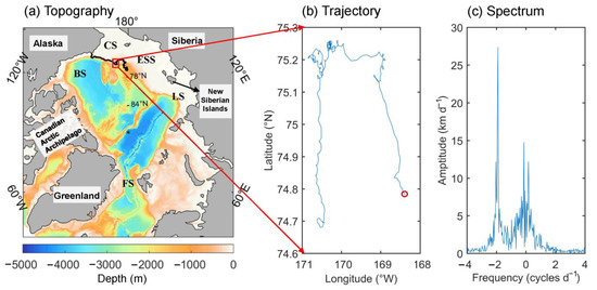 (a) Topography of the Arctic Ocean. Black curve represents the trajectory of buoy (ID: 300234067936870) in 2019. BS: Beaufort Sea; CS: Chukchi Sea; ESS: East Siberian Sea; LS: Laptev Sea; FS: Fram Strait. (b) The trajectory marked by the red box in (a) from 28 July to 26 August is magnified. The start point is marked by the red circle. (c) Rotary spectrum of the buoy drift velocity.