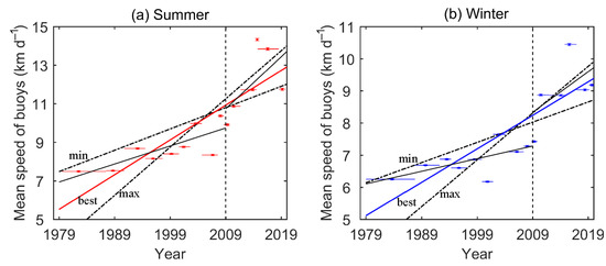 Figure 3 shows the temporal variations of sea ice drift speed in the Arctic Ocean for summer and winter between 1979 and 2019. The trends of ice drift speed are estimated using the error-weighted linear least square method (solid lines in Figure 3). Arctic sea ice drift speed shows significantly increasing trends in both seasons, with 0.18 (±0.07) km d−1 a−1 (i.e., increasing by 32.7% per decade) in summer and 0.10 (±0.04) km d−1 a−1 (i.e., increasing by 20.4% per decade) in winter. The results are compared with the previous estimations in the changing rates of Arctic sea ice drift speed based on different datasets (Table 1). Based on the IABP buoy dataset during 1979–2011, Olason and Notz [24] discovered that Arctic sea ice drift speed increased by 0.11 (±0.03) km d−1 a−1 in August–October and 0.04 (±0.03) km d−1 a−1 in December–March, which were lower speeds than those in this study. The inconsistency may partly result from the difference of seasonal definition. However, the time span of the datasets contributes a lot because the dataset used in this study covers data in the most recent 10 years, a period with a dramatic reduction in sea ice. During this period (2009–2019), a linear fit gives a trend of sea ice drift speed in the Arctic Ocean with 0.27 (±0.53) km d−1 a−1 in summer and 0.13 (±0.27) km d−1 a−1 in winter. It should be noted that the error bounds are twice as big as the mean trends, which may partly result from the few data sampling points (only six bins) in this period. However, the mean magnitude of speed during 2009–2019 increases 40% for summer and 31% for winter compared with 1979–2008. In addition, the trend of sea ice drift speed increases from 0.09 (±0.7) km d−1 to 0.18 (±0.07) km d−1 in summer (from 0.04 (±0.04) km d−1 to 0.10 (±0.04) km d−1 in winter) when the time span is extended from 1979–2008 to 1979–2019. Analyses of sea ice motion during 1979–2019 using the NSIDC dataset showed that sea ice drift speed in Arctic increases at a rate of 0.13 km d−1 a−1 in July–September and 0.08 km d−1 a−1 (a mean value) in the rest of the months [25]. This is comparable with the results in this study. The discrepancy may be caused by the different data source: the NSIDC dataset, a spatiotemporally uniform grid data, is retrieved from satellite imagery and merged with the wind reanalysis data and buoy position data [13]. Although the trends in sea ice drift speed acquired from different datasets are slightly different, all estimations reflect that the increasing rate in ice drift speed is independent of season. It also confirmed that the results based on the IABP dataset in this study are credible.