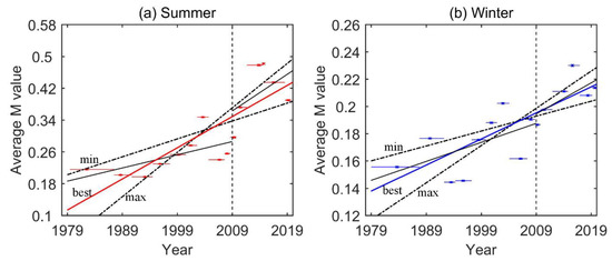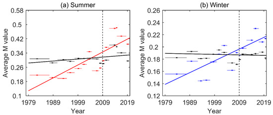 Multi-annual variation of M values in (a) summer and (b) winter during 1979–2019. The red lines in (a) and blue lines in (b) are same as those shown in Figure 4. The black lines in both panels are the multi-annual variations of M0 values based on the null hypothesis. The fitting results in the least square sense can illustrate the effect of buoy spatial sampling on the trends derived from the IABP dataset.