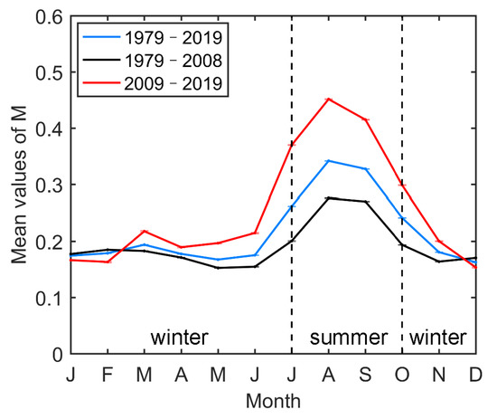 Seasonal variations of M values in 1979–2019 (blue line), 1979–2008 (black line) and 2009–2019 (red line). July, August and September constitute the summer, and the rest are winter.