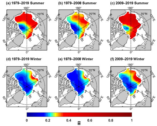 The spatial variation of SIIO is explored in this section. An uniform 25 km-resolution grid covering the Arctic Ocean is constructed. For each grid point (Xj, Yj), the spatially averaged M value, denoted as , is calculated by Equation (10) using the seasonal datasets of M as mentioned in Section 3.2.