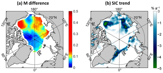 As mentioned in Section 3.2, the SIIO are found to be strengthening significantly in summer during recent years. Figure 7a displays the spatial distribution of the difference in summer between the 2009–2019 period and the 1979–2008 period. There are obvious SIIO enhancements in the Beaufort Sea, East Siberian Sea and Laptev Sea. In order to investigate the possible reasons, the interannual trend in Arctic SIC in summer during 2009–2019 is calculated (Figure 7b). Similar to the pattern in Figure 7a, in the Beaufort Sea and East Siberian Sea where SIIO significantly increase, SIC also exhibits a distinct decline. Thus, it can be inferred that the enhancement of inertial oscillations in marginal seas in recent years is mainly related to the decrease in SIC. However, this does not rule out the influence of the decline of sea ice thickness and atmospheric factors such as the Arctic cyclones. Arctic cyclone activity shows a substantial increasing trend [42] and more storms have been observed in recent decades [43,44], which may have an impact on sea ice motion and enhance atmosphere–ice–ocean interactions. Based on in situ observations, Peng et al. [45] found the sea ice loss during the cyclone process accelerated. The accelerated melting of Arctic sea ice can be more vulnerable to storms, which, in turn, causes sea ice loss.