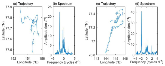Another problem is the contamination of tidal signals. In the whole Arctic Ocean, the semi-diurnal tidal period is close to the inertial period. Compared with other oceans, Arctic tides are weaker. The barotropic tidal model shows that there is weak tidal activity in the central Arctic Ocean but strong tidal amplitude over the Arctic continental shelves [46,47]. In this study, the data in the areas shorter than 150 km away from the coasts is excluded to avoid some aliases due to tides. However, high-value zones of near New Siberian Islands are found in both seasons, more remarkably in the winters of 1979–2008 (Figure 6), which may be a joint result of inertial and semi-diurnal tidal oscillations. As mentioned in Section 2.2, the normalized amplitude of the rotary spectrum at the inertial frequency is used to represent the SIIO strength, although it contains the semi-diurnal tidal component. Relatively strong tides near New Siberian Islands probably make us overestimate the magnitude of SIIO in these regions. Two cases of buoy trajectories (ID: 3004, 26 June 1999 to 25 July 1999; ID: 53095, 23 November 2019 to 22 December 2019) are displayed in Figure 9. For both cases, strong SIIO can be identified from the buoy tracks and the spectrum peaks at the inertial frequency cycles d−1. The semi-diurnal oscillation is evidenced by the peak at cycles d−1, whose amplitude is, respectively, 4.41 km d−1 for buoy (ID: 3004) and 8.83 km d−1 for buoy (ID: 53095). It can be seen from Figure 9b,d that although there is an obvious tidal peak, its contribution is far less than that of the near inertial motion, which ensures that the method used in this paper is feasible and reliable.