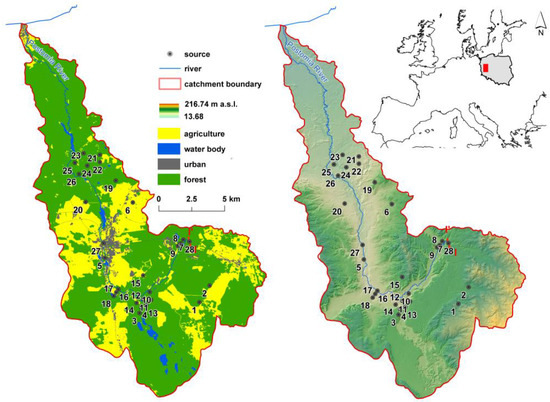 Water samples for physicochemical analyses were collected in the period from 27 to 31 October 2017 from 28 springs in the upper and central parts of the Postomia catchment (Figure 1). All springs identified during the desktop and field studies were selected for analysis. The location of the investigated springs was determined using a GPS GARMIN eTrex 10 device by Garmin Ltd. Measurements taken on-site using a multi-functional measuring device by EIJKELKAMP included water temperature, pH, and electrolytic conductivity (Table 1). Water samples of 500 mL were collected to polyethylene bottles (HDPE) by Nalgene®. Samples used for chemical analyses were acidified in situ. High-purity 65% HNO3 and CHCl3 Pro Analysis® (Merck, Darmstadt, Germany) were used for trace element subsamples in an amount needed to obtain pH < 2. After collection, the samples were taken to a chemical laboratory in a mobile refrigerator at a temperature of 4 ± 2.5 °C. Adequate precautions were applied to avoid water contamination during sample collection, transport, and handling.