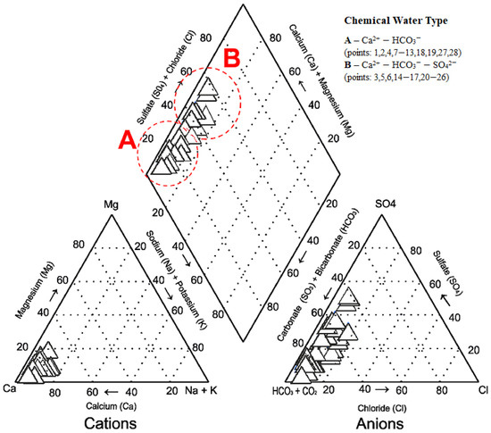 Based on cation concentrations, waters of the analysed springs are of the Ca2+-HCO3− (sampling points: 1, 2, 4, 7–13, 18, 19, 27, 28–50% of spring water samples) and Ca2+-HCO3−-SO42− types (sampling points: 3, 5, 6, 14–17, 20–26–50% of spring water samples) (Figure 2).