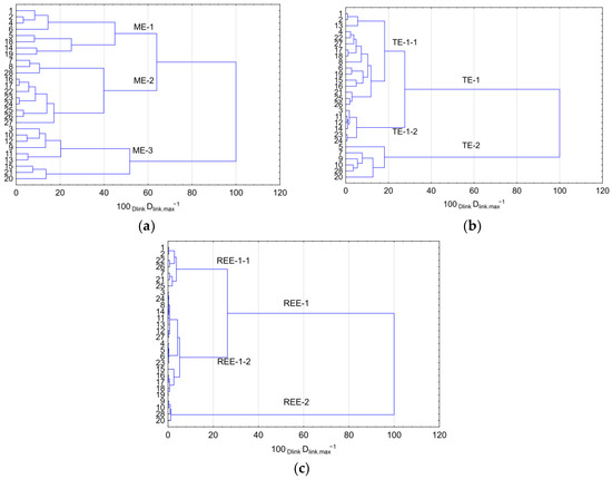 In the next stage of the study, springs were grouped based on similarities observed in their concentrations of MEs (Figure 3a), TEs (Figure 3b) and REEs (Figure 3c).