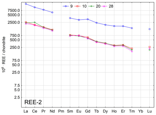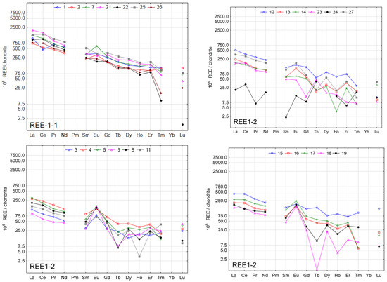 In the fourth stage, to determine the enrichment of spring waters with REEs, their concentrations were standardised in reference to the average concentrations of REEs in chondrite [46]. Then, the results were visualised on graphs to show their pattern. This allowed the identification of anomalies, i.e., concentrations higher than the reference values and the preceding and following REEs. Anomalies in REE concentrations enable the identification of potential sources of pollution and the influence and type of natural processes [44].