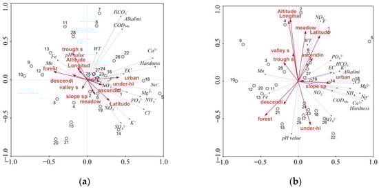 Strong positive correlations with the second principal component PCA2 were found for alkalinity and HCO3−, while the strength of the correlation with CODMn was average. In contrast, negative correlations of average strength were recorded for SO42− and K+ (Figure 5b). No environmental variables included in the analyses were correlated with PCA1 or PCA2. Three water quality parameters were correlated with PCA3. In the case of F− and NO3−, there was a strong positive correlation, and for pH value there was a negative correlation of average strength. With PCA3, strong positive correlations were found in the case of environmental variables investigated in this analysis. Positive correlations were obtained for latitude, longitude, and altitude, as well as the agriculture locations, while for the scarp-foot and forest locations the correlations were negative. In the case of the fourth and fifth principal components, explaining approximately 10% variation, correlations were found for PCA4—EC, Mg2+, Fe, and Mn (negative and average), PCA5—WT (positive and average), and PO43−, Fe, and Mn (negative and average). The last principal component PCA6 explains only 6.3% of the variability in the original data. It was positively strongly correlated with NO2− and negatively, with an average strength, with NH4+.