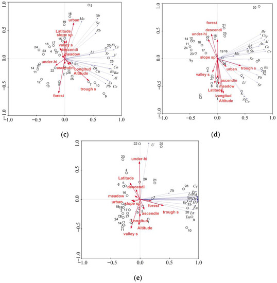 Results of PCA analysis in reference to: (a) MEs—PCA1 vs. PCA2; (b) MEs—PCA1 vs. PCA3; (c) TEs—PCA1 vs. PCA2; (d) TEs—PCA1 vs. PCA3; (e) REEs—PCA1 vs. PCA2.