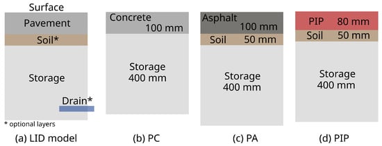 All three PP types were implemented identically into the LID subcatchment, as shown in Table 3.