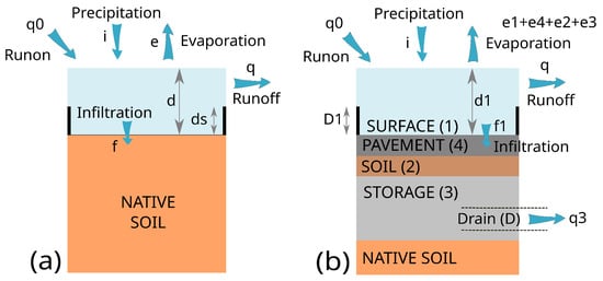 Currently, there are several computational models available to simulate the hydrodynamic behaviour of PPs [,], with some of them being integrated into wider urban drainage models []. However, as mentioned previously, methods for calculating infiltration in a certain subcatchment are diverse. Moreover, with the implementation of PP models, infiltration can also be computed with the recent, in addition to the traditional, thus overlapping several infiltration methods in the same model. Hence, in a particular urban plot, a traditional method can be selected to compute infiltration, but in the adjoining plot or even in a particular area of the former plot, a PP model may be applied to compute infiltration.