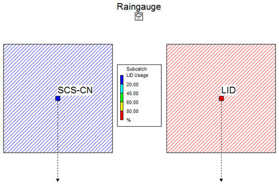 The model setup was designed to compare the performance, in terms of runoff creation capacity, of two different models: the SCS-CN model and the LID model for PPs. To measure and compare runoff hydrographs from two models, two equivalent catchments were created, as shown in Figure 3. The SCS-CN catchment was defined with the general SWMM model and infiltration was calculated with the CN method. The LID catchment was defined as entirely occupied by PP.