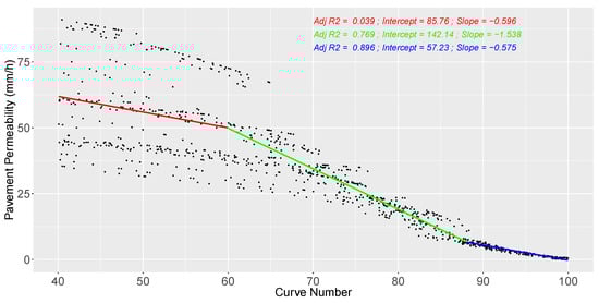 The figure shows a clear correlation between both variables linking the two models. As may be expected, the greater the CN, the lower the pavement permeability that generates an equivalent runoff hydrograph. However, the pattern is clearly different for low and high CNs. A visual evaluation reveals that data dispersion is much greater for low CNs than for high CNs. Based on that visual analysis, the authors propose a linear regression differenced by regions, but only the one for high CNs will be considered, given by Equation (7):