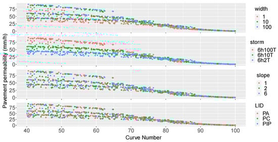 On the contrary, Figure 5 shows how PP layout and pavement slope have no influence on the CN and pavement permeability relation, as those points do not show any pattern. Hence, the following analyses will not consider either one or the other.