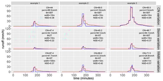 Hence, in order to show the relation between SCS-CN baseline hydrographs and calibrated ones, nine hydrogaph pairs are plotted in Figure 6. The first three pairs are given in the first row, and the selected hydrographs are chosen for the same storm and width case, but selecting one with a low CN, one with a medium CN, and another one with a high CN. The second row shows another three pairs of hydrographs, but in this case, the width is constant and similar CNs were selected. The third row has the same storm and similar CNs, varying the width. The effect of those variables will be analysed along with the NSE variable.