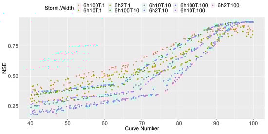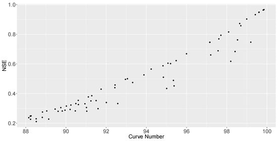Therefore, to check the obtained NSE values after each calibration process, Figure 7 gives 972 NSE values, just grouping the effect for two variables that affect the result, which were previously identified: catchment shape and precipitation depth. Several patterns can be identified from that figure: an improvement in NSE values for higher CNs and also an improvement in those values for higher storm depths and narrower catchments.