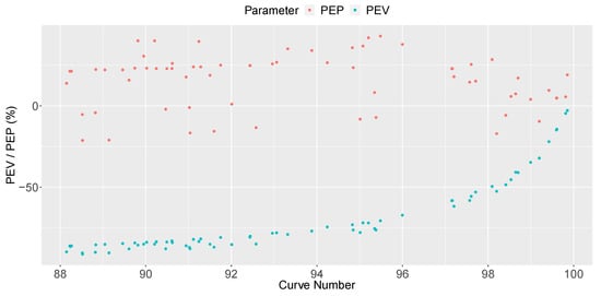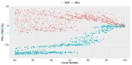 If we compare results in terms of volume and peak performance, see Figure 10, we can see that PEP/PEV values also worsen if compared to a single event, although not as much as the NSE. In this continuous event, PEP/PEV values with an error lower than appear only for CN values higher than 98, while for the single event, that threshold value was around CN 90. This is also explained by the rain pattern and the infiltration method provided by both models. Same as in the single event, peak values perform better than volumes in the continuous event.