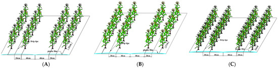 The schematic diagram of maize planting pattern with 80 cm wide and 40 cm narrow rows. (A) D1: 80,000 plants ha−1, with plant spacing of 21 cm; (B) D2: 100,000 plants ha−1, with plant spacing of 17 cm; (C) D3: 120,000 plants ha−1, with plant spacing of 14 cm.