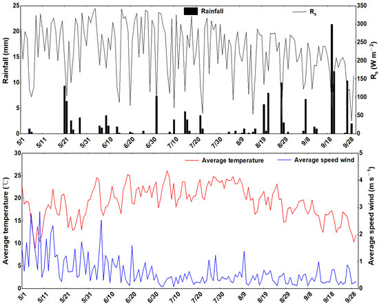 The meteorological data including solar radiation, air temperatures, wind speed, relative humidity, and rainfall were obtained from a standard automatic weather station (Hobo, Onset Computer., Bourne, MA, USA) installed at the experimental site. The daily average temperature, solar radiation, rainfall, and wind speed during the whole growing period of maize are shown in Figure 2.