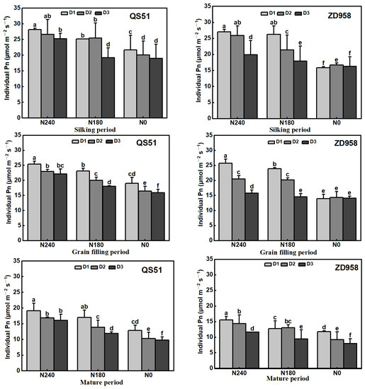 Effects of planting density and nitrogen (N) rate on individual photosynthetic rate (Pn) of maize at different growth stages. D1: 80,000 plants ha−1; D2: 100,000 plants ha−1; D3: 120,000 plants ha−1; N0: no N application; N180: 180 kg N ha−1; N240: 240 kg N ha−1. Bars are the means ± standard deviation (n = 3). Different lower-case letters denote significant differences at p < 0.05 among treatments at the same growth stage.