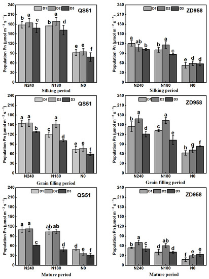 The changes in population Pn (Figure 4) among the treatments varied greatly from those of individual Pn. The population Pn showed a decreasing trend as the reproductive period progressed. The population Pn increased with increasing N ate at the same planting density for both varieties, but there was no significant difference between N180 and N240 at D1 and D2. At the same N rate, population Pn exhibited a first increasing and then decreasing trend with increasing planting density for both varieties, with the maximum population Pn at D2. Compared with D2, D1 and D3 reduced population Pn by 4.7% and 24.3%, respectively. Overall, the maximal population Pn was achieved in the D2N180 treatment, which had the highest potential for maize yield. In comparison with D1N240, D2N180 significantly increased population Pn by 3.8% (QS51) and 16.8% (ZD958).