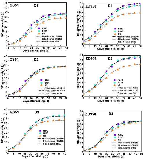 Dynamic changes of 100-grain weight for QS51 and ZD958. D1: 80,000 plants ha−1; D2: 100,000 plants ha−1; D3: 120,000 plants ha−1; N0: no N application; N180: 180 kg N ha−1; N240: 240 kg N ha−1.