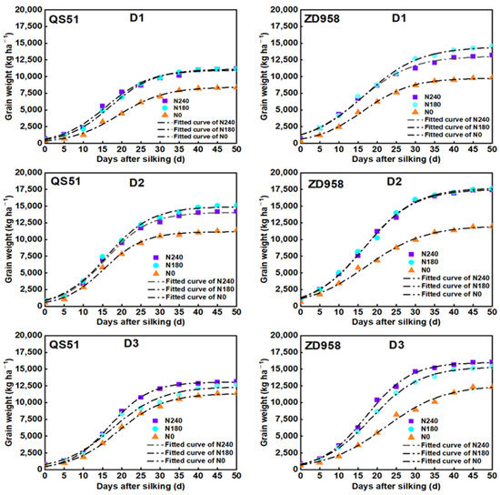 Dynamic changes of grain weight for QS51 and ZD958. D1: 80,000 plants ha−1; D2: 100,000 plants ha−1; D3: 120,000 plants ha−1; N0: no N application; N180: 180 kg N ha−1; N240: 240 kg N ha−1.