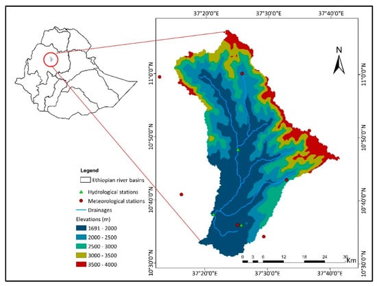 Birr River watershed is situated in the northwestern highlands of Ethiopia. Geographically, the watershed is located between the longitude of 37°10′ and 38°50′ E and the latitude of 10°30′ and 11°10′ N (Figure 1). The watershed is characterized by rough topography and a wide range of elevations ranging from 1691 to 4084 m above sea level. The total drainage area of the watershed is 3062 km2. Many small tributary streams contribute to high discharge to the Birr River watershed during the summer season and are distinguished by substantial spatial and seasonal variability in rainfall. Based on the rainfall patterns, there are three distinct seasons: the main rainy season, which runs from June to September, the minor rainy season, which runs from February to Ma, and the dry season, which runs from October to February [57,58]. The estimated mean annual rainfall for the watershed is 1389 mm based on 32 years of recorded data (1986–2018) obtained from nearby representative meteorological stations, (Figure 2). The northwestern region of the watershed has an estimated annual rainfall was 1391 mm, while the southwestern tip near the mouth of the basin was 1026 mm. The estimated maximum temperature also ranges between 23 and 30 °C, while the lowest temperature varied between 8 to 12 °C, with an average temperature of 18 °C (Figure 2). Figure 2 depicts the average maximum and minimum temperatures, as well as rainfall, in the Birr River watershed. The estimated gauged area of the Birr River watershed covers 1500 km2 (Figure 1). The watershed is significant on local and national magnitude. It includes a high irrigation potential, a high value of cash crops, livestock production as well as tourism, because of the existence of an impressive landscape, and a unique source of biological diversity [20,57].
